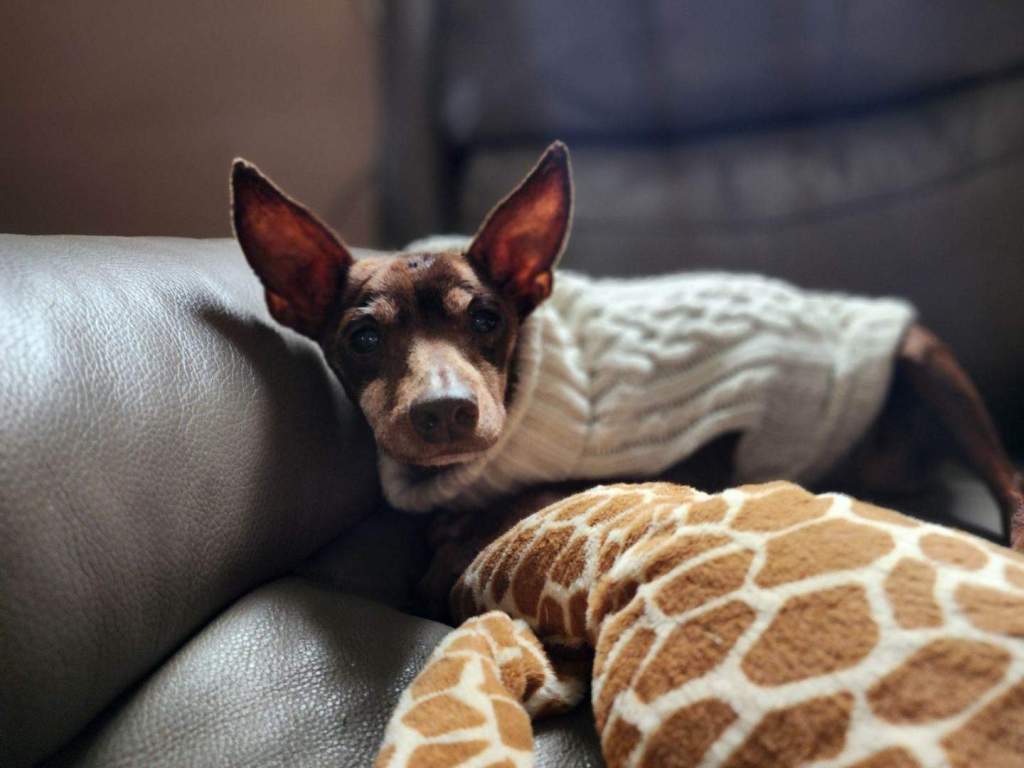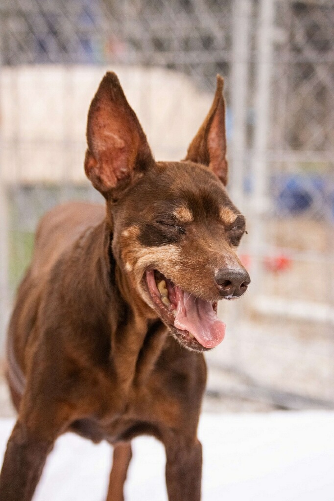 Trevor is a min-pin who is an older guy, guessing around 12 yrs, he likes to lounge on a dog cot outside & his favorite past time is eating & sleeping.